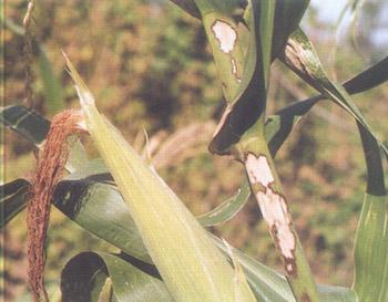 癥狀 紋枯病(俗稱"花腳稈","爛稈瘟")是近年來發生危害日益嚴重的一種新病害。四川省各地均有發生,以高溫、高濕條件下和夏播玉米發病較嚴重。其寄主甚廣,除危害玉米外,還可侵染水稻、小麥、大麥、高粱、棉花、大豆等多種作物。該病主要危害葉鞘,也可侵染葉片、苞葉和果穗,玉米拔節至成熟期均可發病。開始從莖基部的葉鞘感病,后侵染葉片并向植株上部蔓延。發病初期,光出現水漬狀灰綠色圓形或橢圓形病斑,后轉為白色至淡 黃色,發病后期,變為紅褐色云紋狀斑 塊。當濕度較大時,病斑上常長出許多白霉(菌絲和擔孢子);當溫度較高或植株已老健不適合病菌擴大危害時,即產生菌核,多藏于葉鞘內。菌核初為白色,老熟時呈褐色。葉鞘受害后,葉片萎蔫,嚴重時整株枯死,果穗受害后,可使苞葉干枯,果穗腐爛。